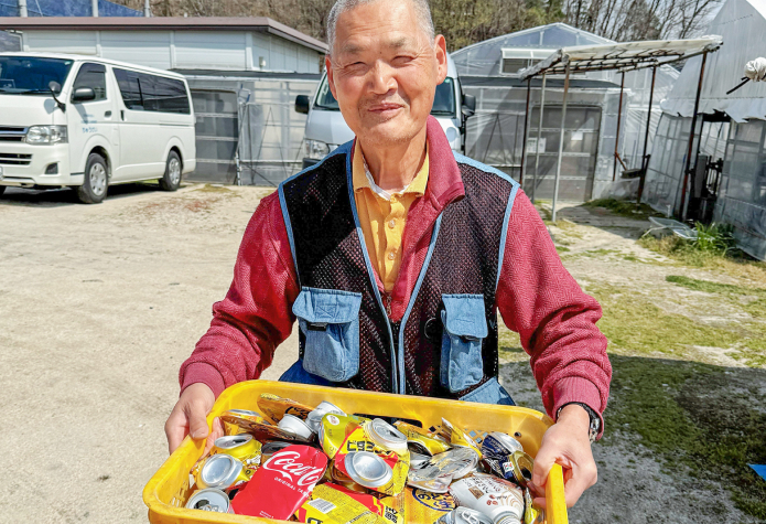 芸南学園正門前の回収ボックスでアルミ缶を集めています。また、地元企業や団体にも回収の協力をいただき、集めたアルミ缶をつぶしてリサイクルに回しています。